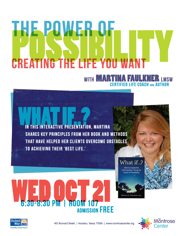 Spend an evening with certified life coach and author Martina Faulkner, LMSW, learning how to harness the power of possibility to create the life you want. In this interactive presentation, Martina shares the experience she has gained working with coaching clients as well as key principles from her new book.
