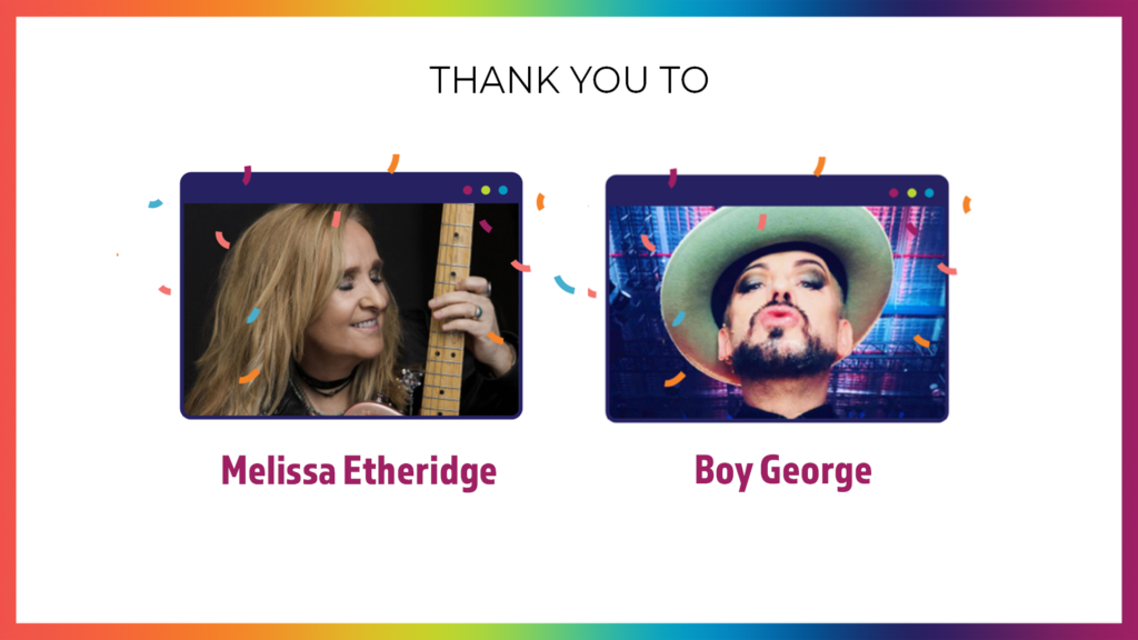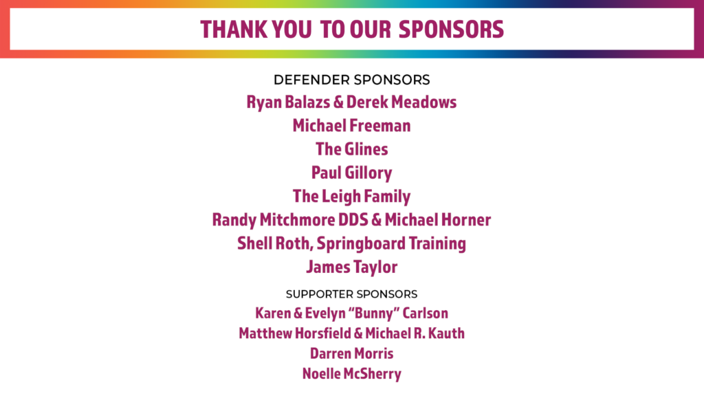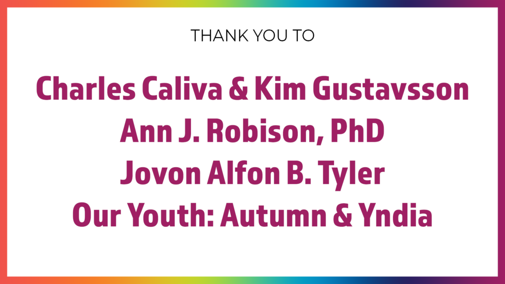 Host Regina Thorne-DuBois was gracious and elegant. Performances by Athena Oya Sapphire, Dina Jacobs, Eric Michael Krop, and Duo Dorado (Amy Armstrong and Fernando Gonzalez) gave us goose bumps. Celebrity guests Melissa Etheridge, Boy George, Latrice Royale, and Jai Rodriguez sent special messages. Executive Director Ann J. Robison, PhD, and Concierge Travel’s Kim Gustavsson and Charles Caliva thanked donors and spoke about the impact of the gifts received. Jovon Tyler shared his story, as well as Autumn and Yndia, two youth currently receiving assistance.