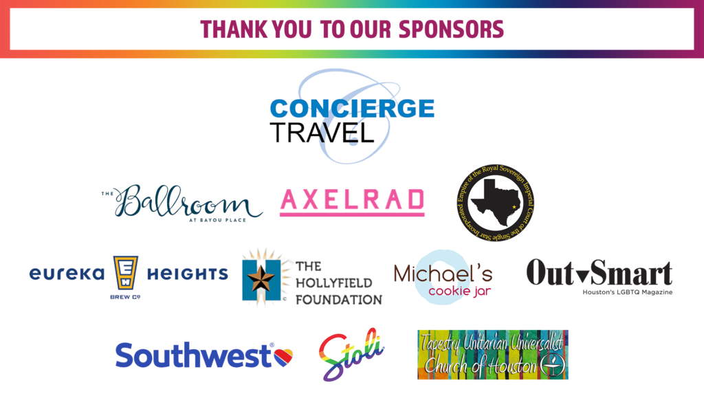 Thank you to Advocate Sponsors Bruce A. Breeding, Kim Gustavsson & Charles Caliva, and Scott Ulrich & Ernest Trevino and Protector Sponsors Richard Werner & Tony Bravo. And, of course, a big thank you to our Presenting Sponsor Chevron and underwriters Concierge Travel, the Ballroom at Bayou Place, Empire of the Royal Sovereign & Imperial Court of the Single Star Inc. of Houston (ERSICSS), Axelrad, Eureka Heights Brew Co., The Hollyfield Foundation, Michael’s Cookie Jar, OutSmart Magazine, Southwest Airlines, and Stoli.