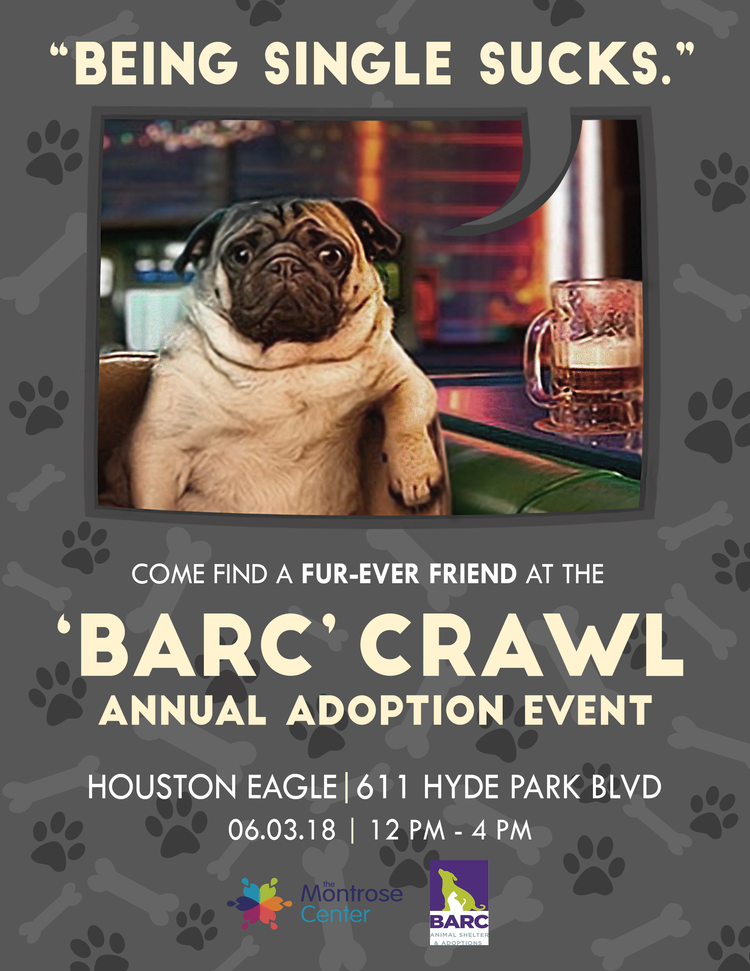 The Houston Eagle is graciously hosting the first annual BARC adoption event on their patio and allowing friends of the Montrose Center to bring out some dogs from the BARC animal shelter and put them on display! Come grab a drink and get to know these fellas who are all looking for a FUR-ever home 🙂 Some of you may just want to drink, some of you may want to adopt, some may want to foster, and some of you just know how rewarding a FUR-ever friend really is. Everyone is welcome. There will be a team of dog trainers present at the bar to answer any questions you have may have. There will also be a photographer for all of you who may just want a cute Instagram post with the pups!