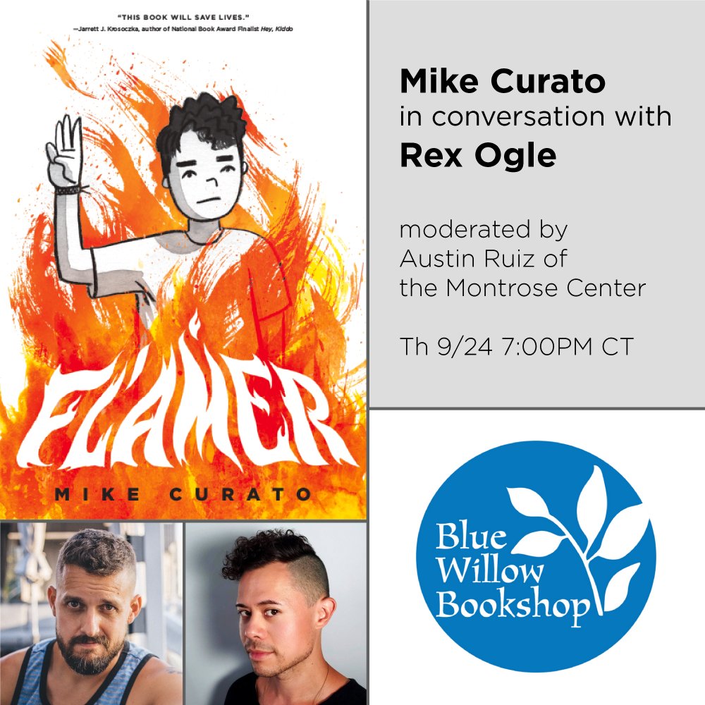 Mike Curato (Flamer) will appear in a conversation with Rex Ogle (Free Lunch), moderated by Austin Ruiz of the Montrose Center. This event will take place on Blue Willow’s Facebook Live stream.