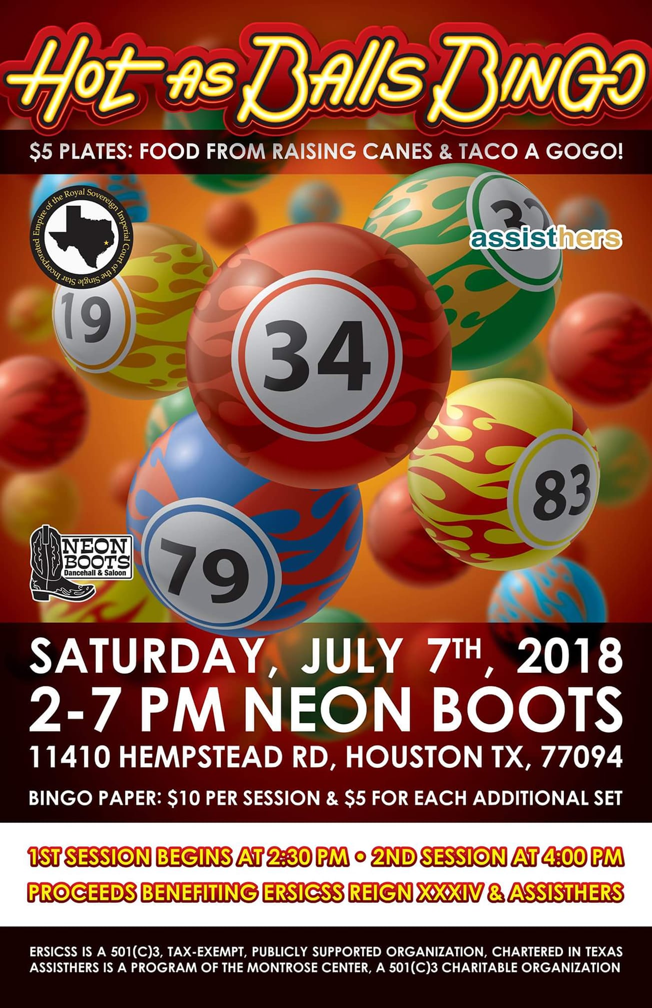Come out to Neon Boots on July 7 for an exciting occasion of BINGO benefitting AssistHers and the Reign XXXIV Charity, Pet Patrol. We will play two full sessions of BINGO (ten games in total). Your first card per session is $10; add more cards to each session for $5 each. Note that BINGO sales are cash only – an ATM is available on premises.