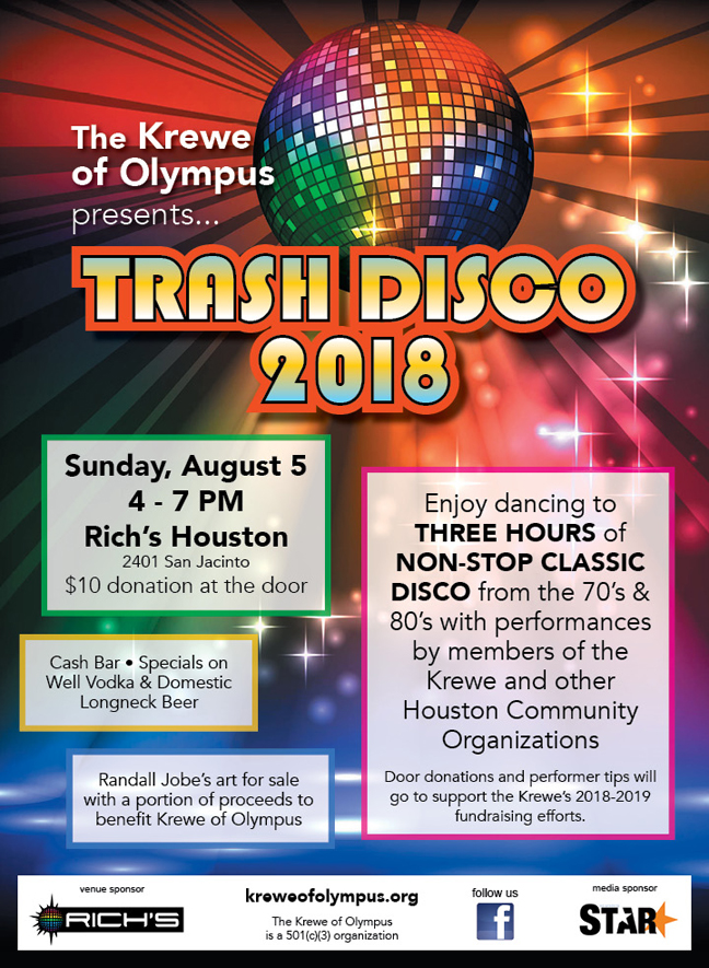 Enjoy dancing to 3 hours of non-stop classic Disco from the 70’s & 80’s with performances by members of the Krewe and other Houston Community Organizations. $10 suggested donation to attend.