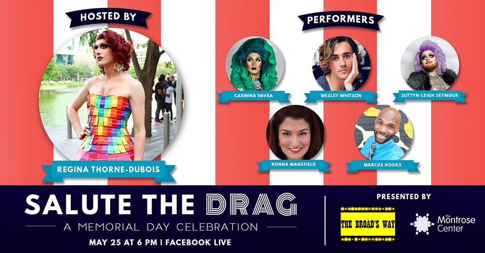 Hosted by Regina Thorne-DuBois, we’ll be live streaming a patriotic salute to drag and Broadway. Tune in onto the Montrose Center’s Facebook page on Monday, May 25th at 6 PM!