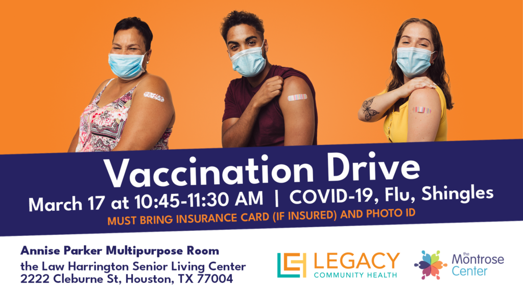 Let’s get vaccinated y’all! Join the Montrose Center and Legacy Community Health for a free vaccination drive! No RSVP is required. The following vaccines will be offered: