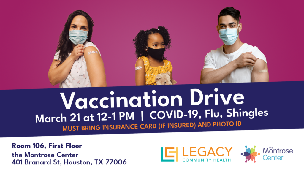 Let’s get vaccinated y’all! Join the Montrose Center and Legacy Community Health for a free vaccination drive! No RSVP is required. The following vaccines will be offered: