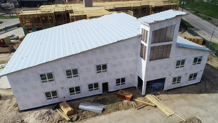 The two-story community center shows the most progress as insulation has been put in place, windows have been installed, sheetrock is going up, and the roof is almost complete. Check out the comparison to last month!