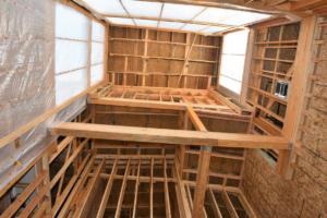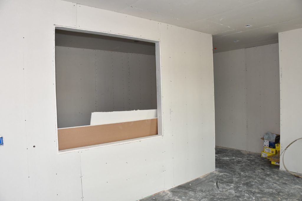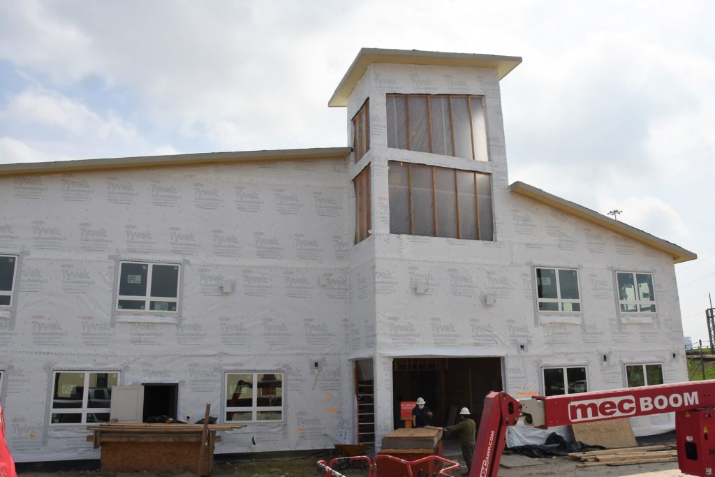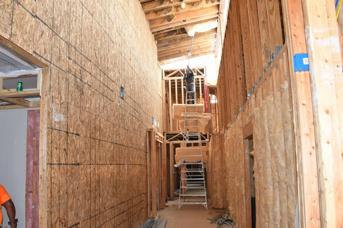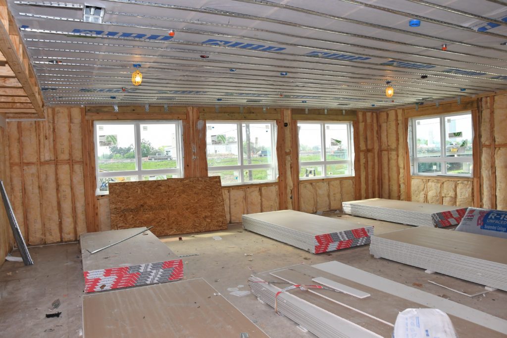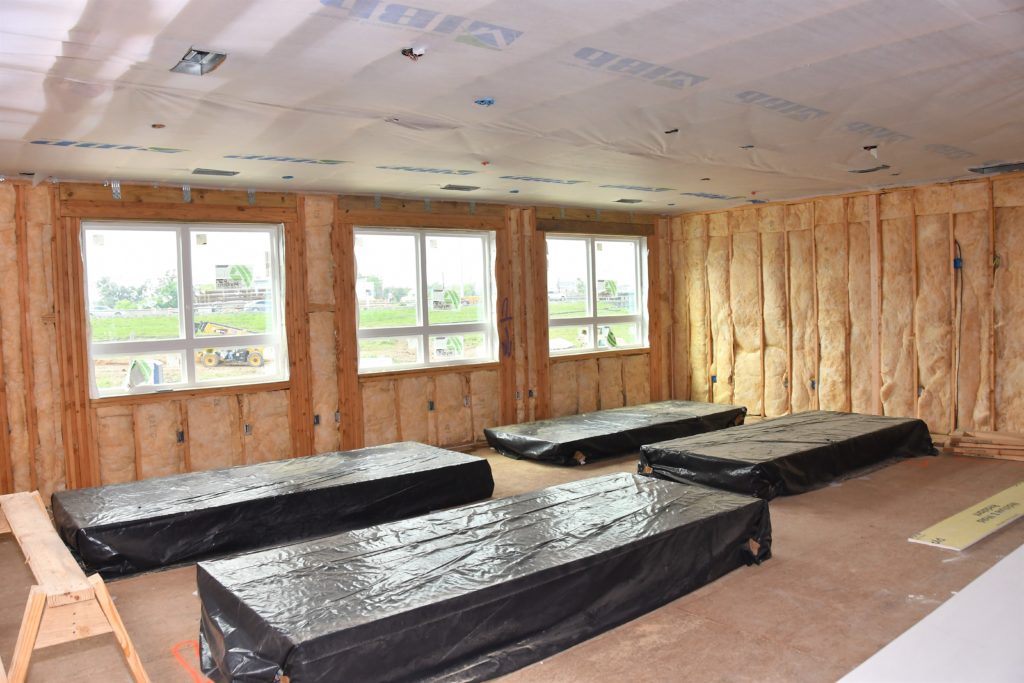 The two-story community center shows the most progress as insulation has been put in place, windows have been installed, sheetrock is going up, and the roof is almost complete. Check out the comparison to last month!