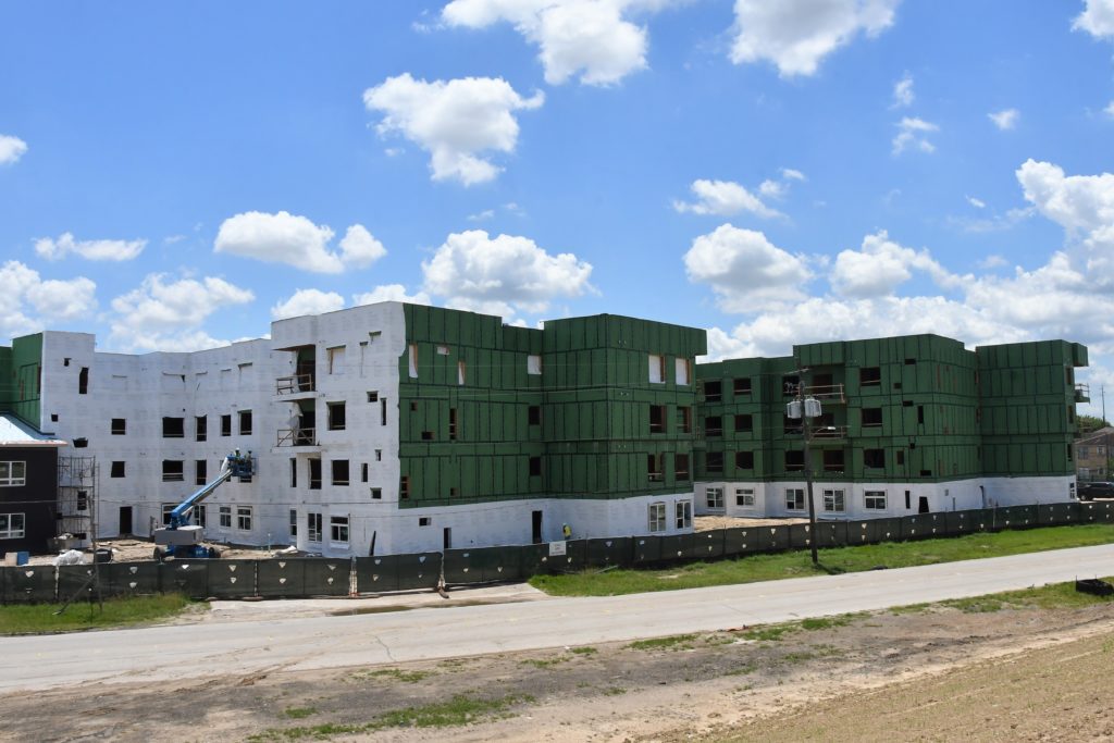 Framing for all four stories of the the one and two-bedroom independent living apartments is complete, and work on the exterior and interior continues.
