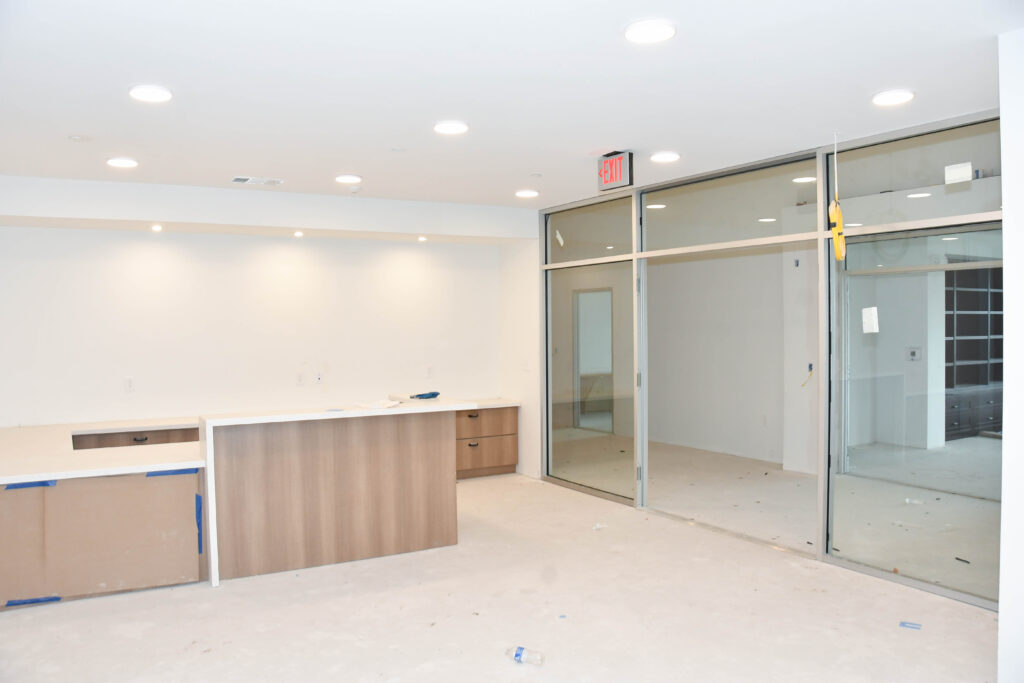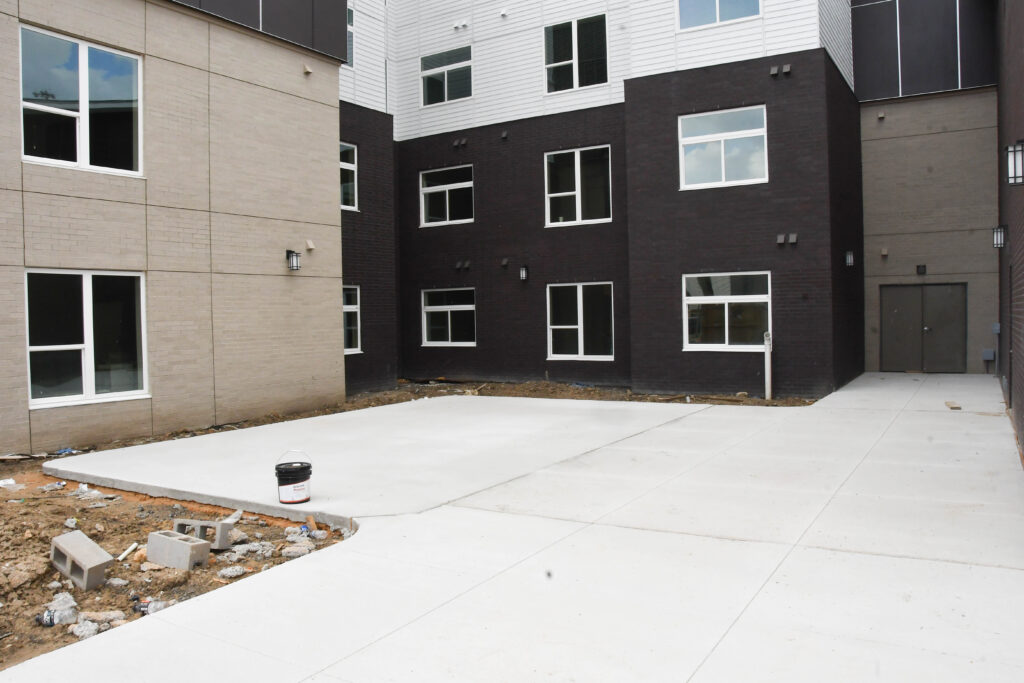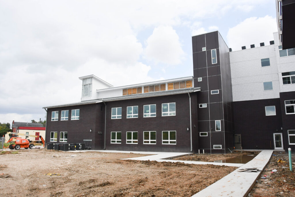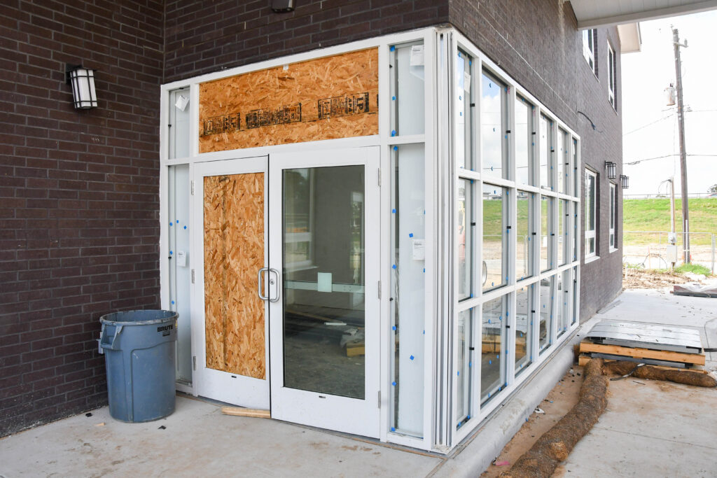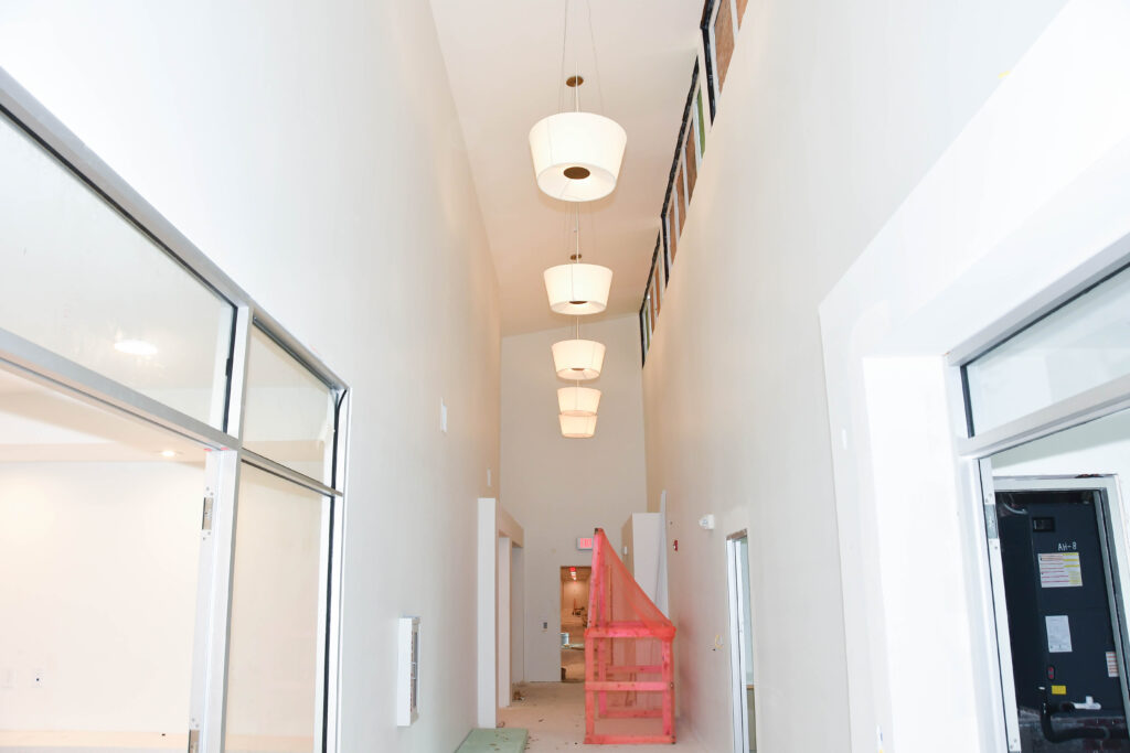 Compared to our September update, there has been much progress made at the Center. Externally, you can see patios, walkways, curbs, fencing, and other exterior finishes coming together. You can also see windows and doors installed at the entrance.