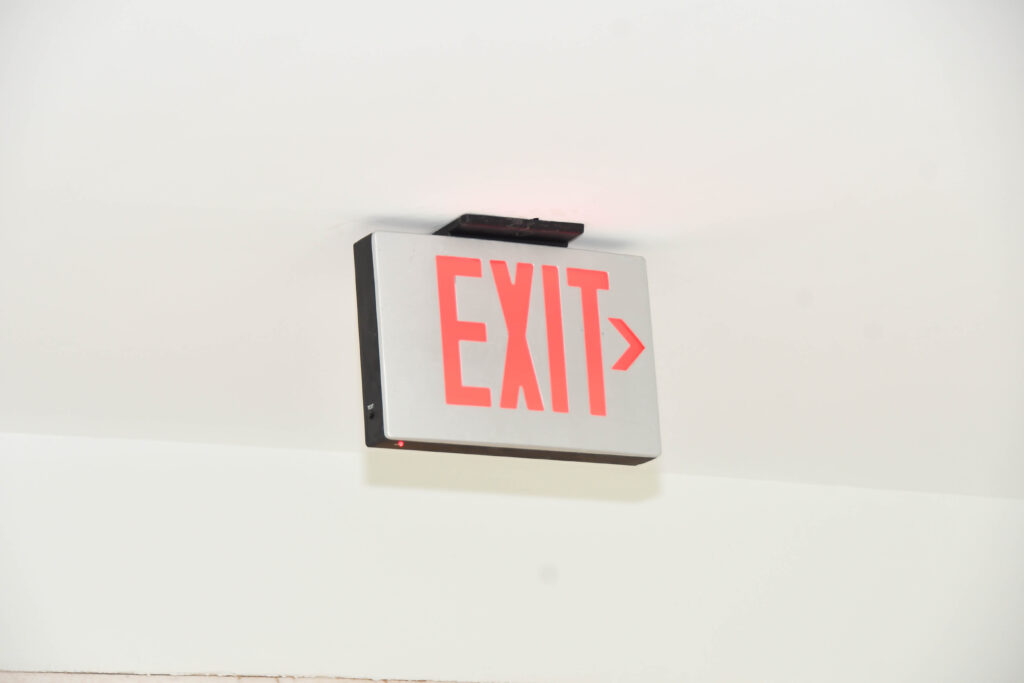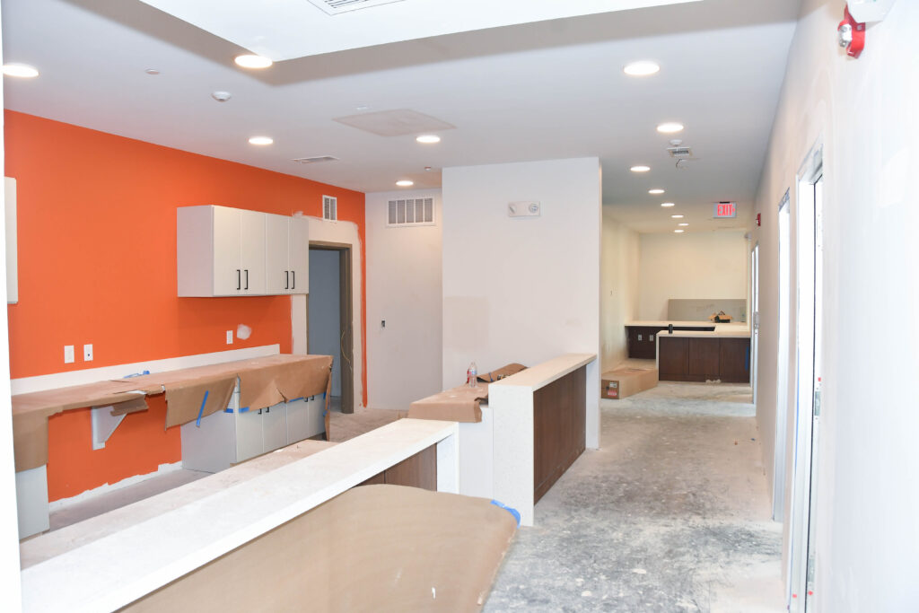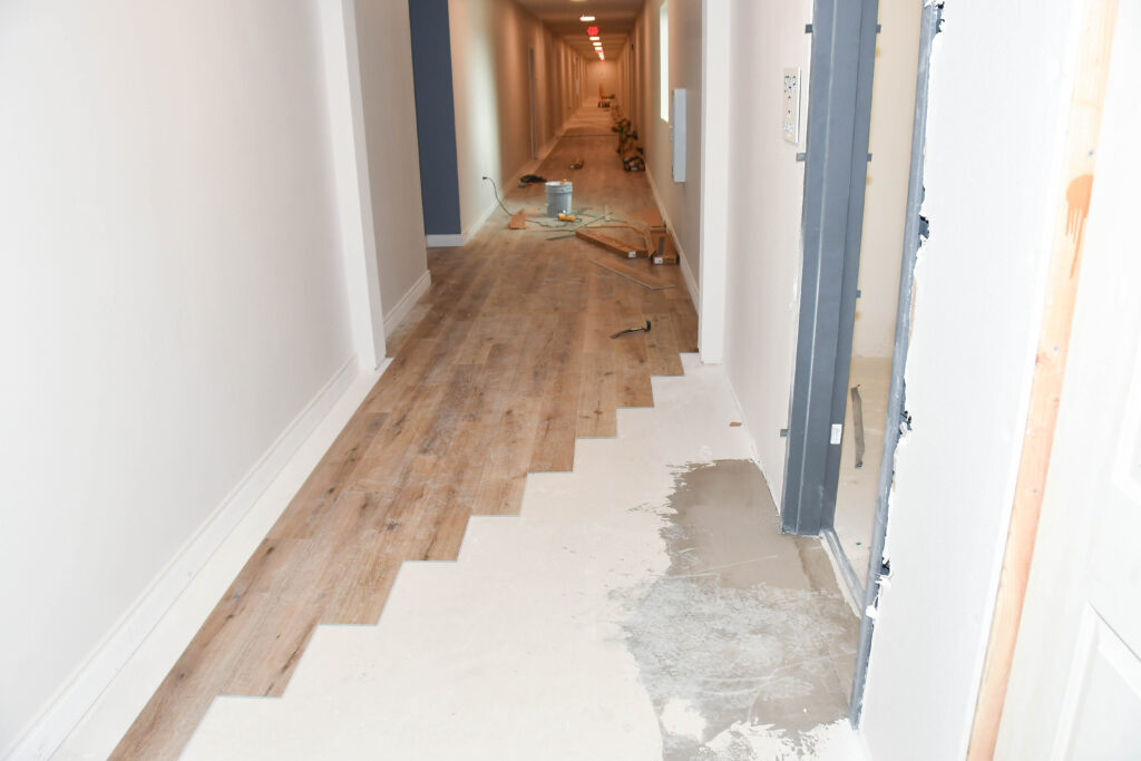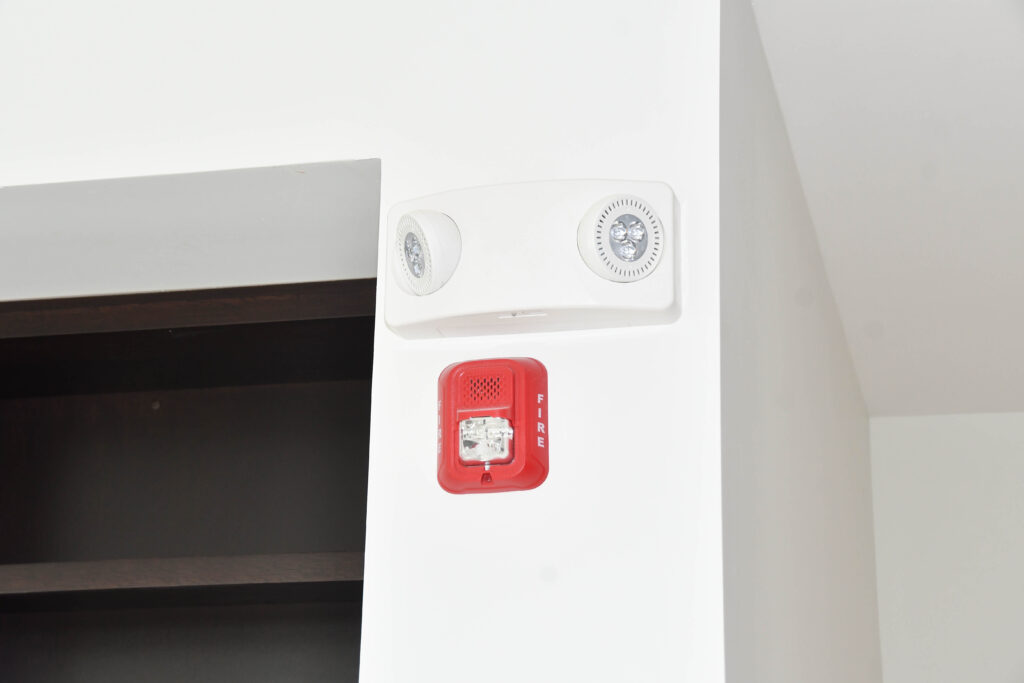 Throughout the complex, there are fire alarms, emergency lights, and exit signs going up. You can also see painting and flooring in progress.