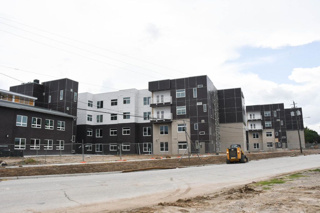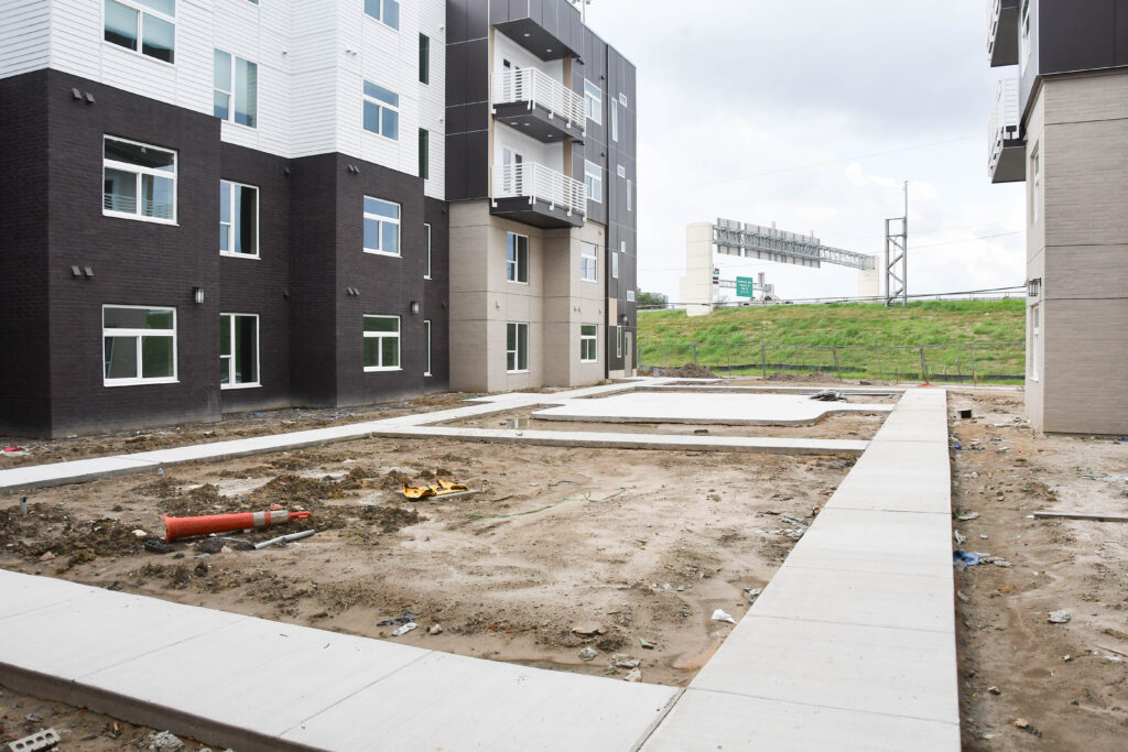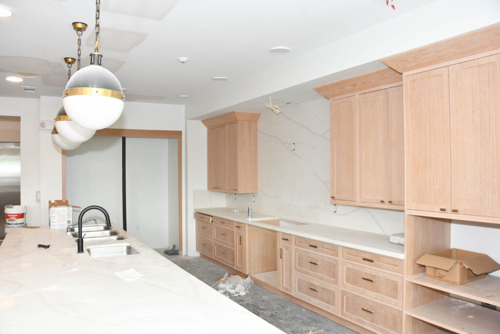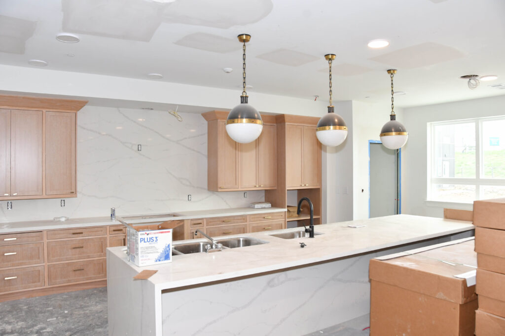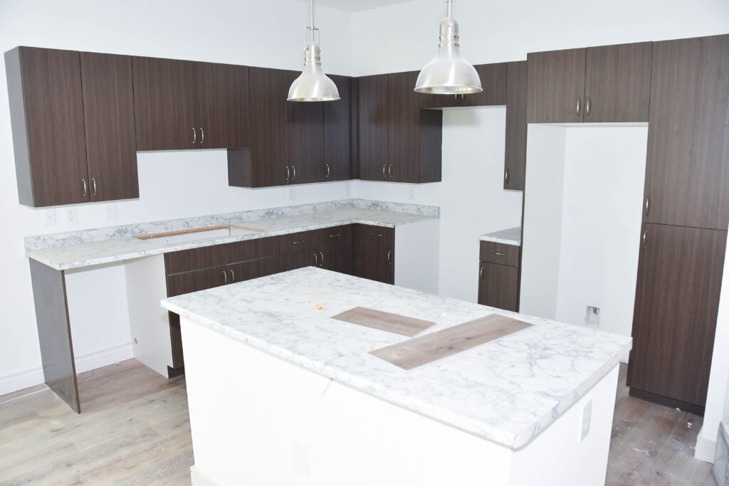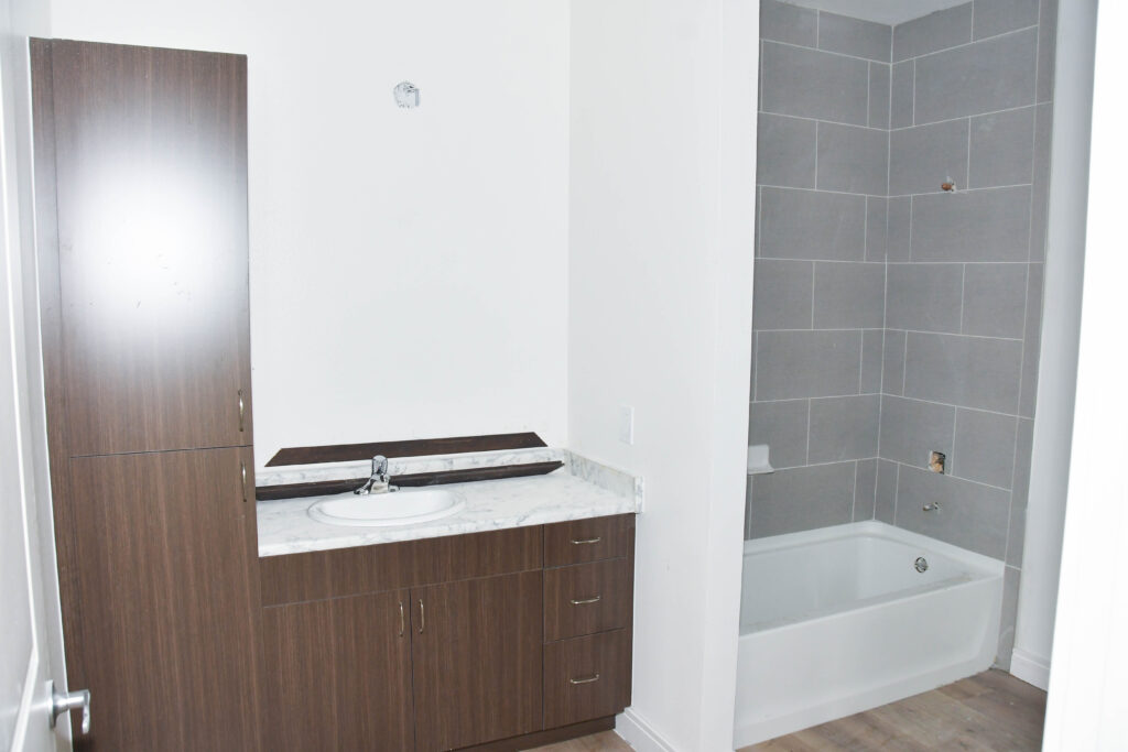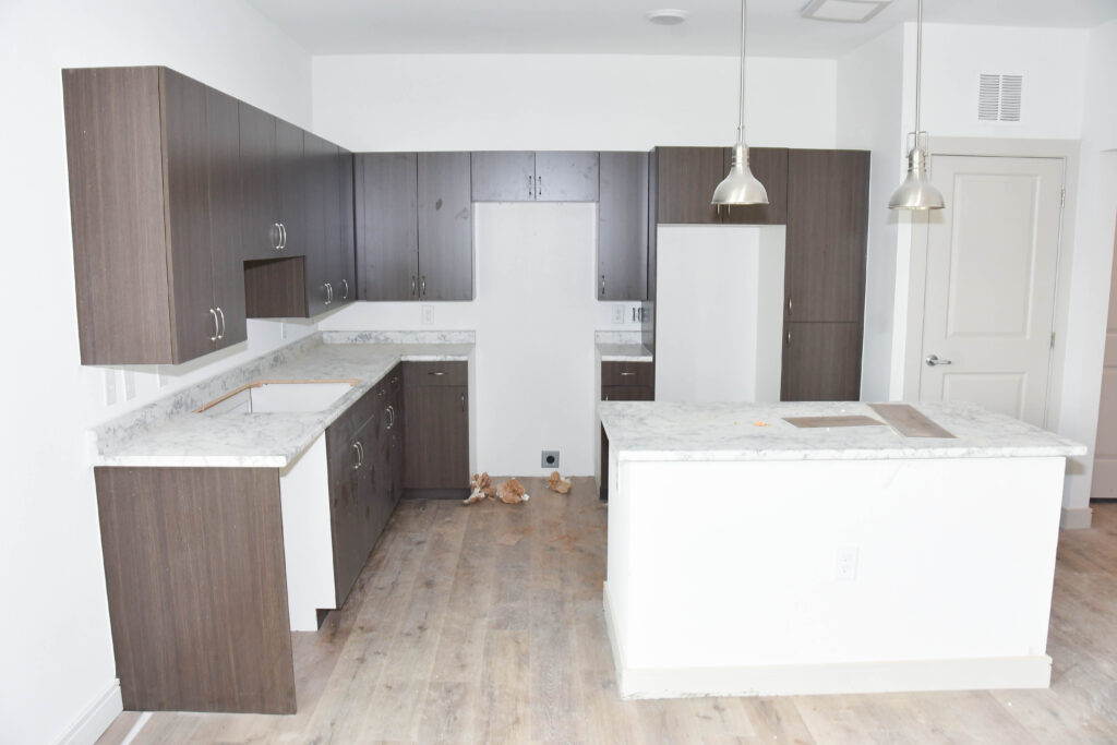 In the apartments, many are almost complete. You can see cabinetry, countertops, lights, tiling in the showers, sinks, and flooring.
