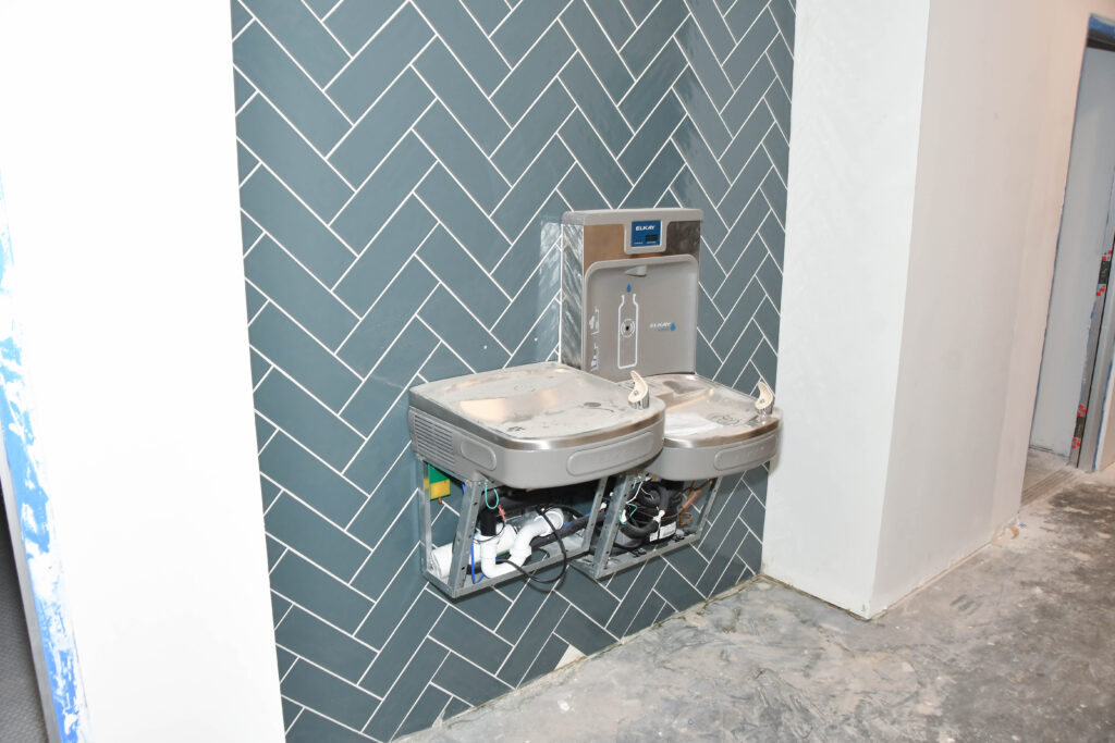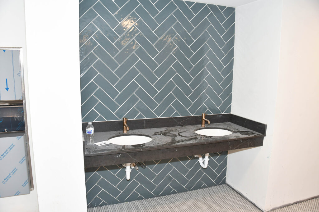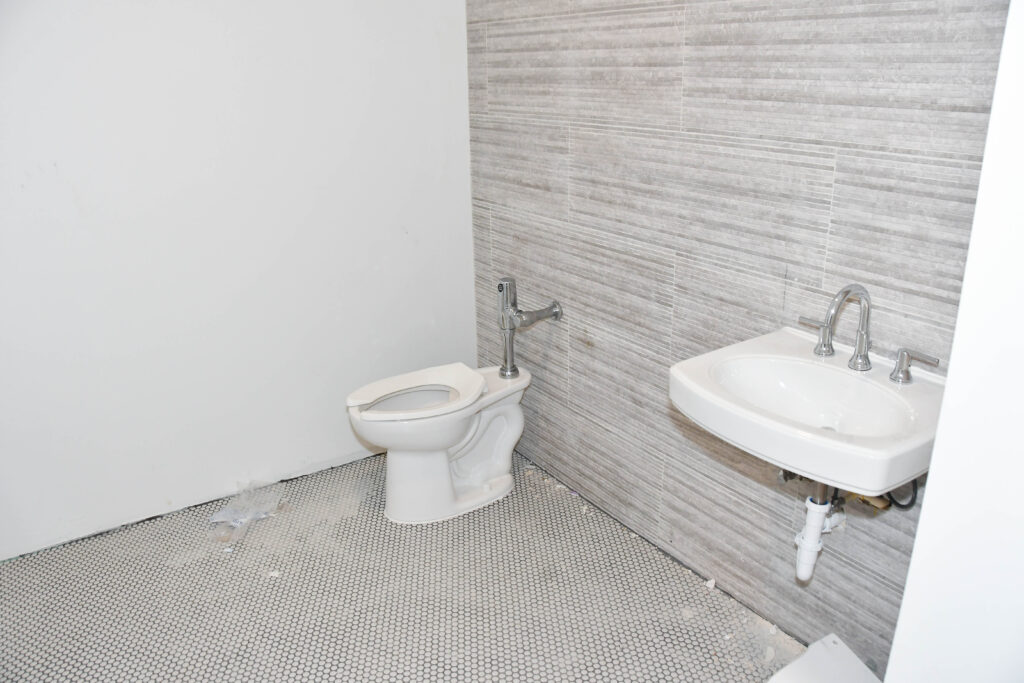 Many of the communal restrooms have the portico tiles installed as well as sinks and toilets