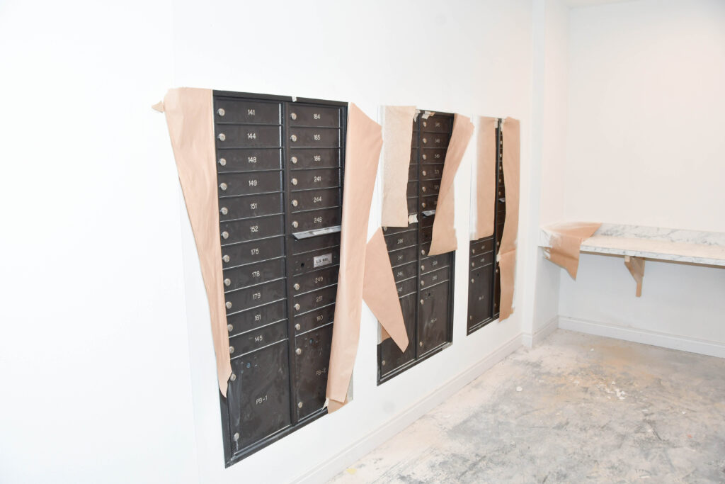 Inside of the building, you can see cabinetry, lights, windows, glass, countertops, and other finishes in common spaces and hallways. You can also see mailboxes and water fountains as well.