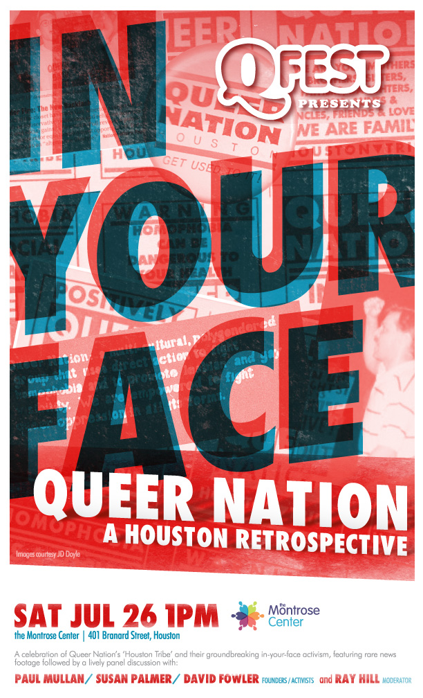 Join us for a celebration of Queer Nation Houston at the Montrose Center on Saturday, July 26th at 1:00 p.m. This program will feature rare news clips highlighting Queer Nation’s ‘Houston Tribe’ groundbreaking in-your-face activism followed by a lively discussion. The panel will be moderated by Ray Hill, and feature special guests Paul Mullan, Susan Palmer, and David Fowler — all three founding members and activists with Queer Nation Houston.