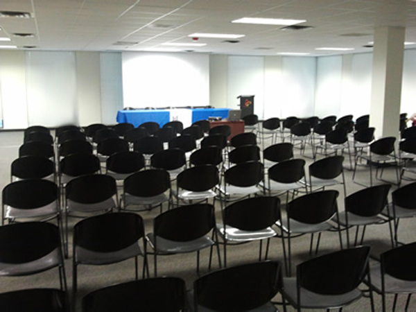Ideal for large meetings/lectures, intimate performances, and film screenings that require flexible seating arrangements. The room includes stack seating for up to 100 guests. This room comes with a podium, ten (10) 60” round tables that can seat up to 8 people each, as well as one (1) small 3’ rolling, rectangular table and four (4) 4’ rolling, rectangular tables. There is a retractable screen for video projection and small rolling projection table that can be lowered using the switch on the pillar in the room.