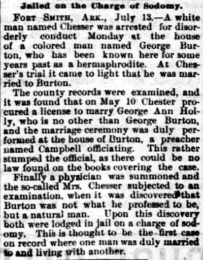 Records were examined that found that on May 10th James Chesser procured a license to marry George Ann Holly, also known as George Burton, and the marriage ceremony was duly performed at the house of of Burton, with a preacher officiating the union. Chesser and Burton admitted that they “convinced” clerks that Burton always presented as a woman. At this time, there were no state laws on the books covering a case like this.