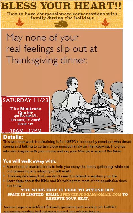 the Montrose Center 401 Branard St., HoustonThis workshop discuss tools and skills for how to best deal with religious family members during holidays. It is specifically... Read More »